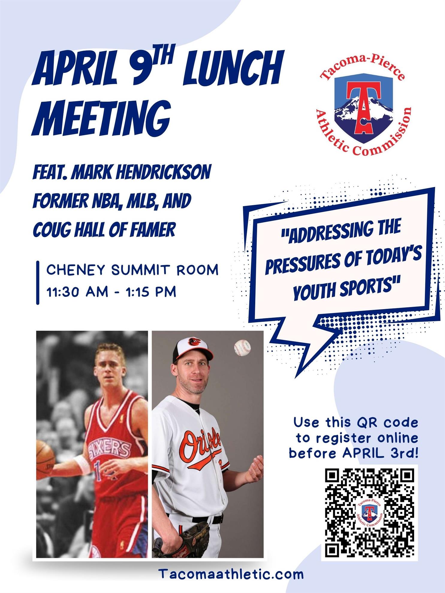 Register for April 9th, 2026 Lunch Meeting - Mark Hendrickson! Join us on April 9th for the Tacoma-Pierce Athletic Commission's monthly meeting! Our guest speaker will be Mark Hendrickson. Mark Hendrickson is one of only 13 athletes ever to play in both the NBA and Major League Baseball. He is the only one to do it in the past 40 years and the only one to play at least four seasons in each league. A 6-foot-9 forward on the basketball court and a left-handed pitcher in baseball, Hendrickson exhibited two-sport stardom back to his high school days when he led Mount Vernon to two state basketball championships (1991, 1992) and two state baseball championships (1990, 1992). He was a 13th-round baseball draft pick in 1992 but headed to Washington State University focused on basketball. He was a two-time, first-team all-Pac-10 selection. When he concluded his WSU basketball career in 1996, he was second for career rebounds (927) and third for points (1,496). He was the 31st overall pick in the 1996 draft by the Philadelphia 76ers. He played 114 NBA games with four teams. He had pitched eight games at WSU as a junior, and MLB scouts kept drafting him. He signed with the Toronto Blue Jays, playing some minor league ball while still in the NBA. In 2002, he made his Major League debut. He was a full-time starting pitcher for three seasons with Toronto and Tampa Bay. He continued for 10 seasons in the majors, winning 58 games. He also hit the first home run by a pitcher in the history of the Toronto Blue Jays. Social hour will be from 11:30 AM to 12:00 PM, followed by the meeting from 12:00 PM to 1:15 PM at Cheney Stadium. |