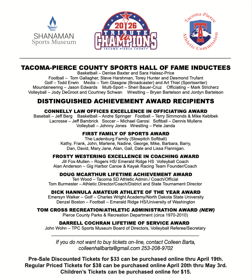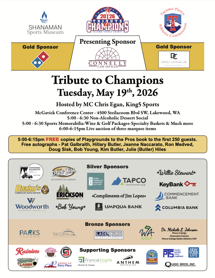 Tribute to Champions 2025![]() 2025 Tribute to Champions - May 13 - Buy Tickets join us for Distinguished Achievement Awards and Hall of Fame inductions Tuesday, May 13 at Clover Park Tech’s McGavick Conference Center — 4500 Steilacoom Blvd SW, Lakewood Hosted by MC Chris Egan, King5 Sports 5 - 6:30 p.m. Dessert social and silent auction benefitting the Tacoma Pierce County Sports Museum Preview auction items here 6 - 6:15 p.m. Oral auction of three marquee items 6:30 p.m. Awards presentation begins Free copies of the extensive Playgrounds to the Pros book about sports in Tacoma-Pierce County for the first 280 attendees. Hall of Fame inductees Kate Rue, Chelle (Flamoe) Miller, Suzanne (Vick) Paulson, Phil Carter, Vince Goldsmith, Leo Randolph and Joe Waters will be available for autographs from 5 to 6:15.