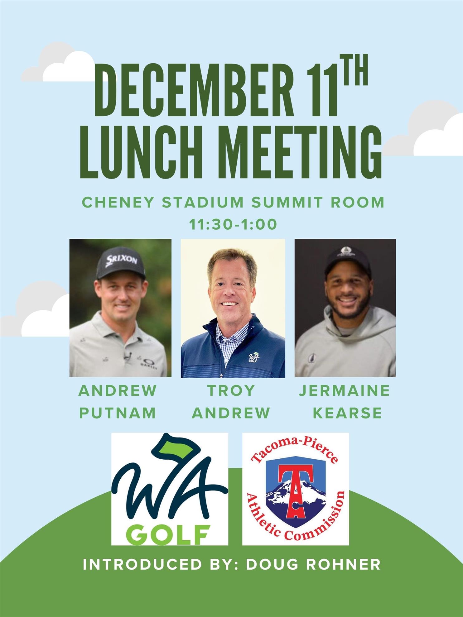 Join us on December 11th for the Tacoma-Pierce Athletic Commission's monthly meeting! We’re excited to welcome Troy Andrew, CEO and Executive Director of Washington Golf. Troy will discuss, among other things, WA Golf’s Youth on Course program, where junior golfers pay only $5.00 green fees at over 80 courses statewide, PGA Touring Pro Andrew Putnam’s Scholarship fund, and former Lakes, UW, and NFL Star Jermaine Kearse’s Future Fairways program. Andrew and Jermaine are expected to join us virtually. Please join us for lunch and an engaging conversation with Troy Andrew! Social time will be from 11:30 AM to 12:00 PM, followed by the meeting from 12:00 PM to 1:15 PM at Cheney Stadium.