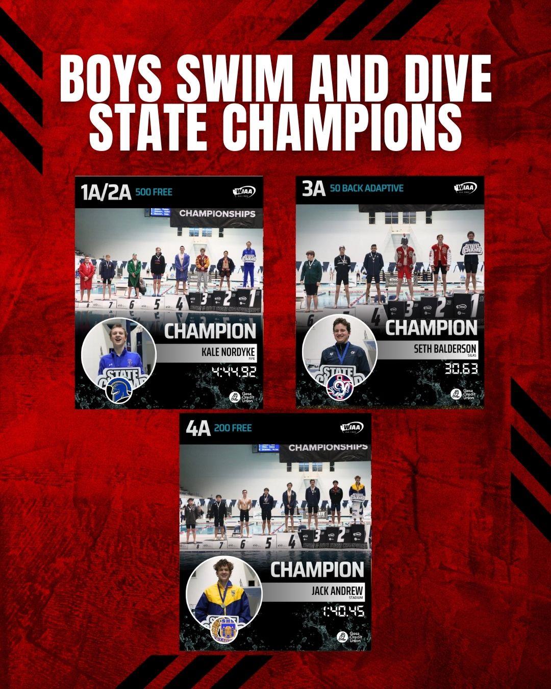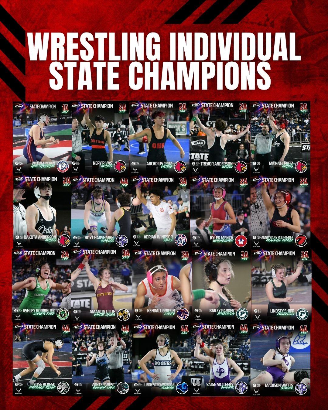 GIRLS: Girls 2A 105 lbs: Kyler Menza Washington Girls 2A 135 lbs: Amayrany Rodriguez Franklin-Pierce Girls 2A 190lbs: Ashley Rodriguez Clover Park Girls 3A 125 lbs: Amanda Lillie White River Girls 3A 130 lbs: Kendall Griffin Lakes Girls 3A 155 lbs: Bailey Parker Peninsula Girls 3A 170 lbs: Lindsey Shipp Peninsula Girls 4A 100 lbs: Elise Albeso Emerald Ridge Girls 4A 120 lbs: Winter West Bonney Lake Girls 4A 130 lbs: Lindy Strowbridge Rogers Girls 4A 135 lbs: Madison Watts Sumner Girls 4A 140 lbs: Saige McCleery Sumner | 4A Men 200-yard Freestyle: Jack Andrew Stadium 3A Boys 50-yard Backstroke Adaptive Seth, Balderson Silas 1A/2A Boys 500-yard Freestyle Kale, Nordyke Fife
