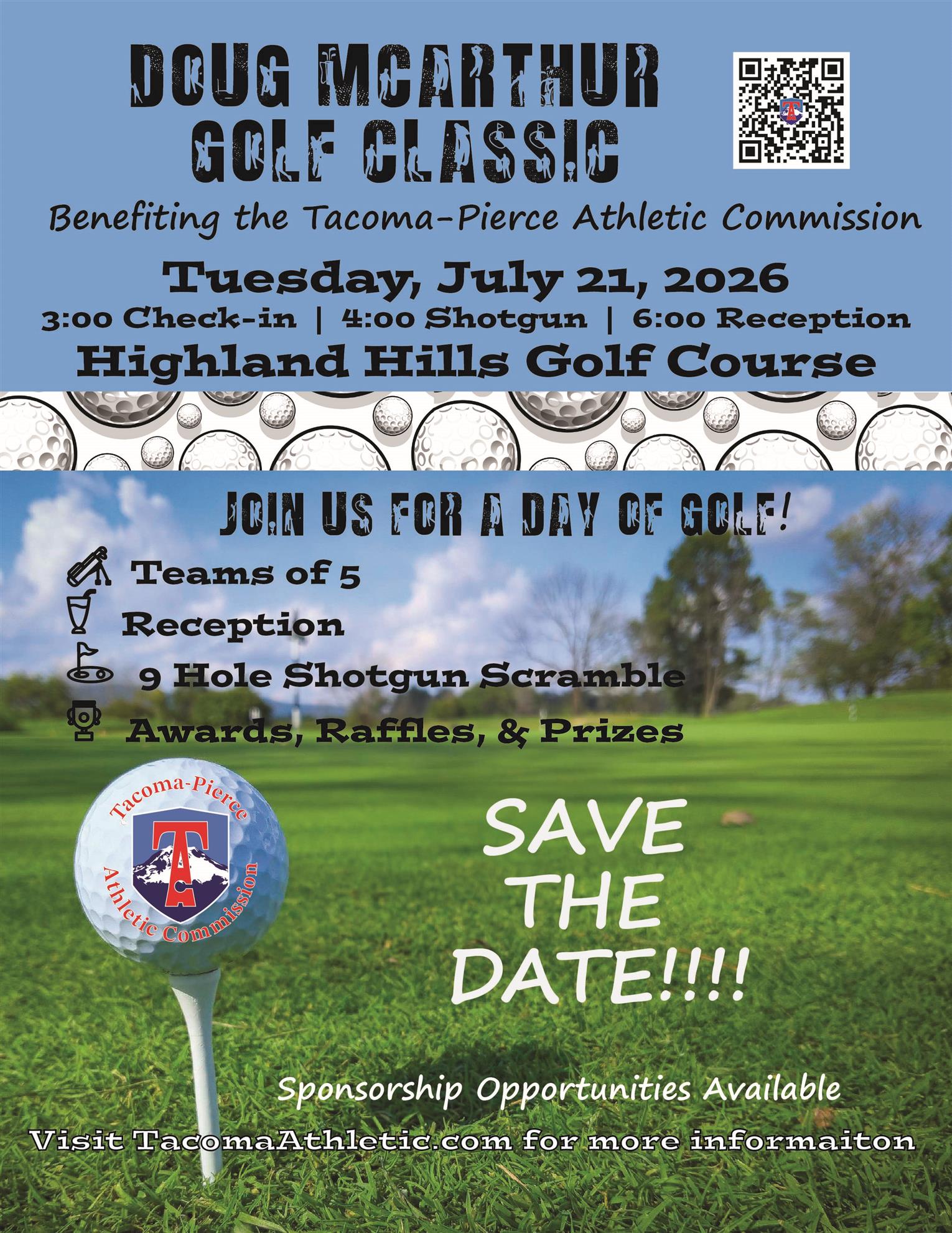 Please save the date for our Annual Doug McArthur Golf Classic Tournament on July 21st, 2026, at Highland Hills Golf Course! Check-ins begin at 3:00 pm, and the shotgun start begins at 4:00 pm, followed by a reception at 6:00 pm. Save the Date! Doug McArthur Golf Classic