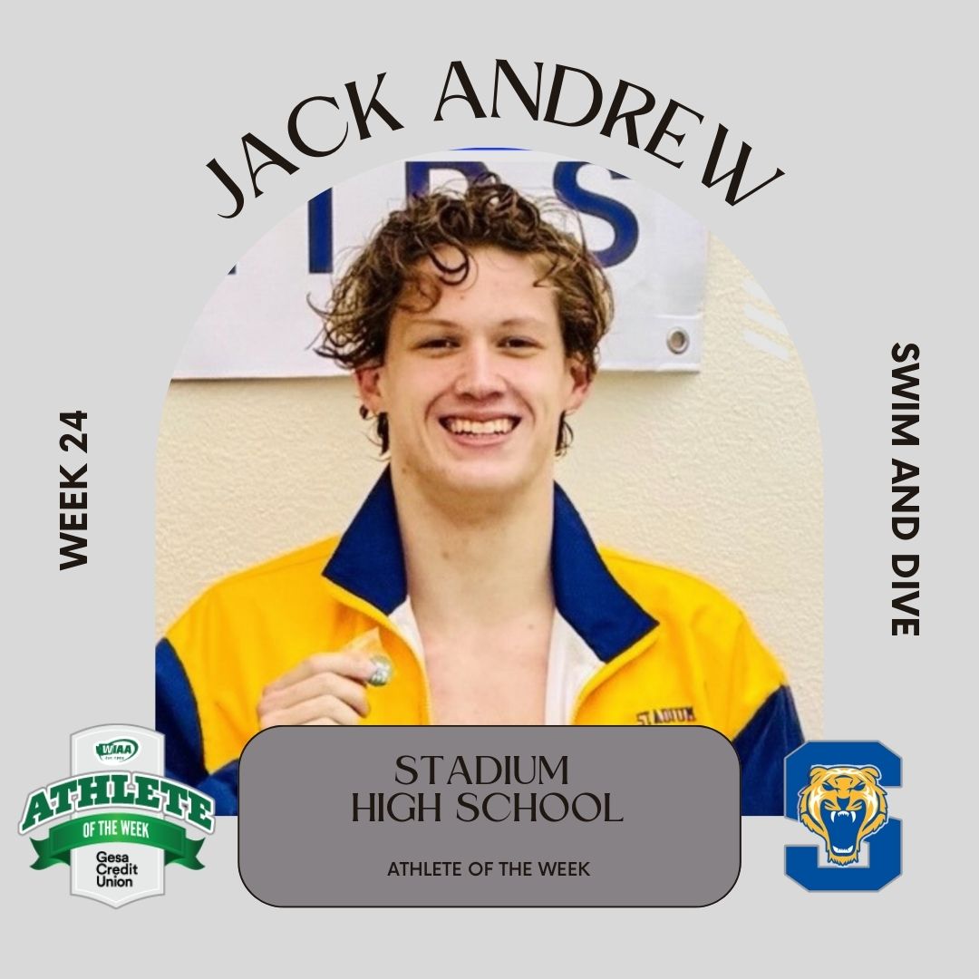Senior Jack Andrew has built an exceptional career at Stadium High School, excelling both in the pool and in the classroom. A two-time USA Swimming All-American (2024 & 2025) and USA Swimming Junior National qualifier, Andrew is a four-year state qualifier, two-year team captain, and the school record holder in the 200 freestyle. He has reached the WIAA State Championship finals in each of the past three seasons, earning five podium finishes, including runner-up and third-place finishes in multiple events. At the 2026 district meet, Andrew captured titles in the 200 freestyle and 100 butterfly, earned High Point Swimmer honors with 130 points, and anchored the 400 freestyle relay to a silver medal.WIAA 2025-2026 Week 24 - Jack Andrew